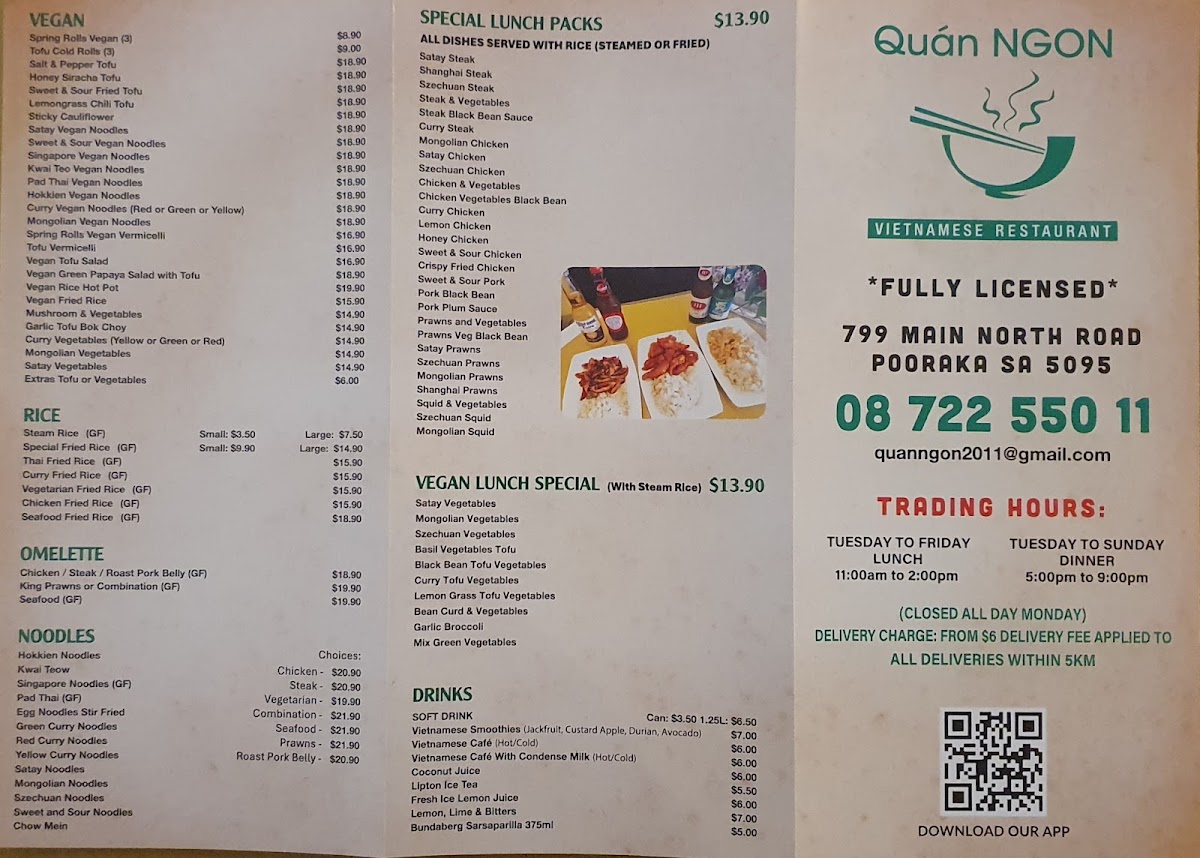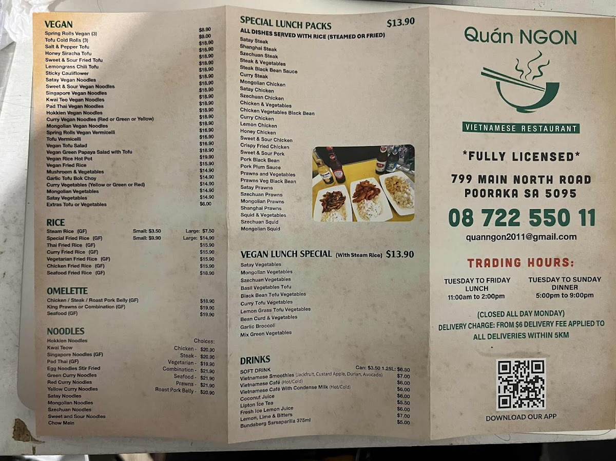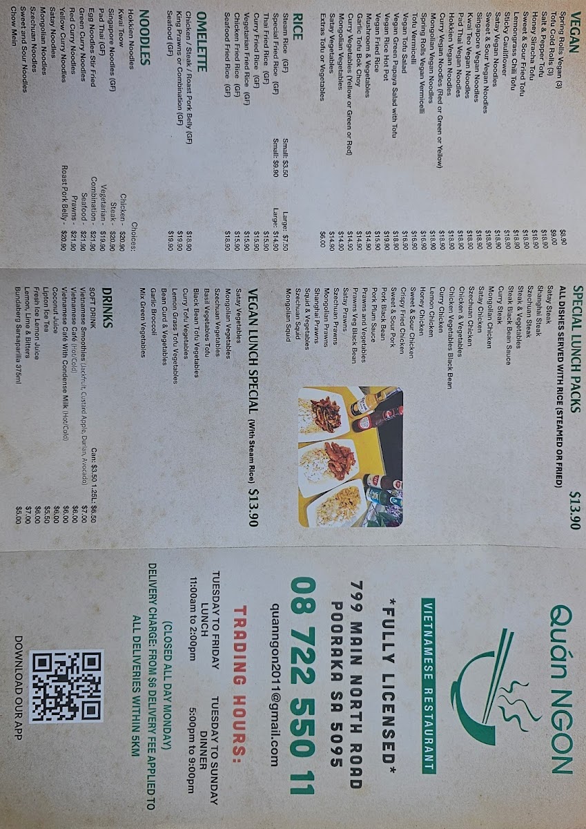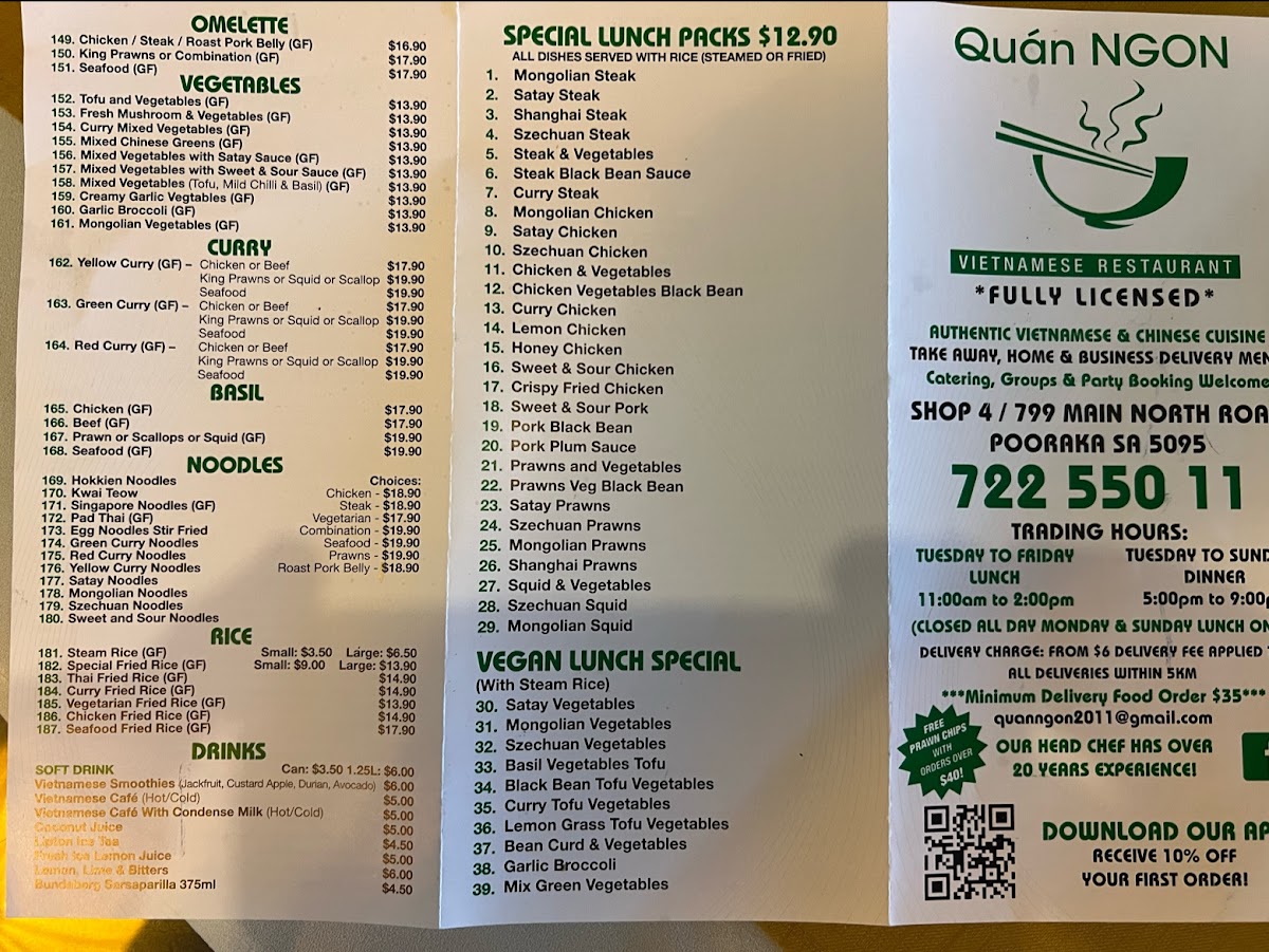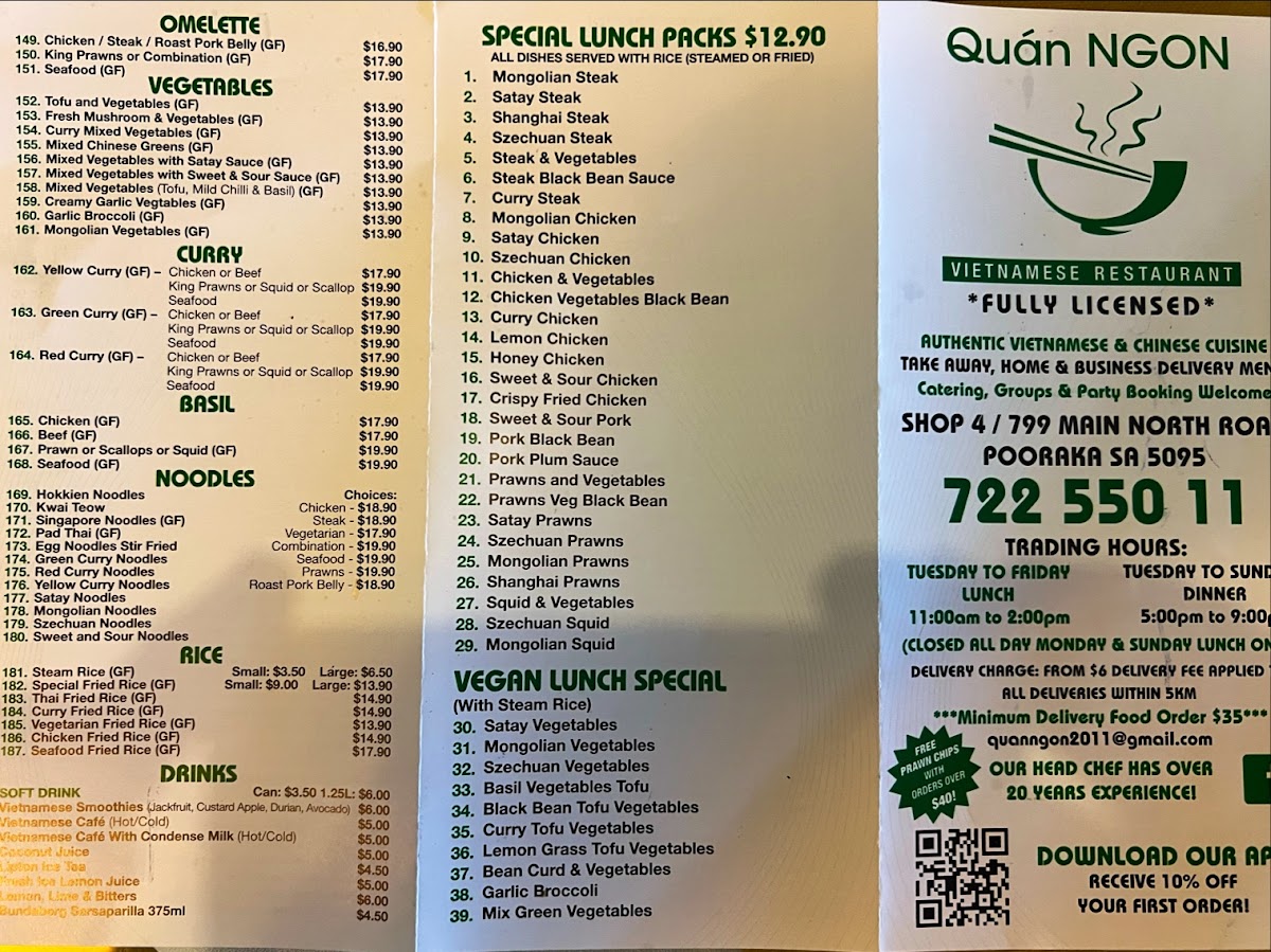 At Quan Ngon, the menu feels like a carefully balanced snapshot of everyday Asian comfort food, where familiar favorites and vegan-friendly choices sit comfortably side by side. Classic bowls such as Pho, Laksa, and Combination Beef Noodles Soup deliver the warm, aromatic depth expected from long-simmered broths, while options like Combination Noodle and Chicken Noodle Bowl Take Away cater well to diners looking for something quick yet satisfying. Rice-based dishes are equally strong, with Combination Broken Rice, Pork Belly with Rice, and Clay Pot Rice offering hearty portions that highlight the kitchen’s focus on bold seasoning and comforting textures.