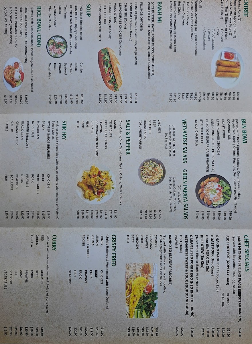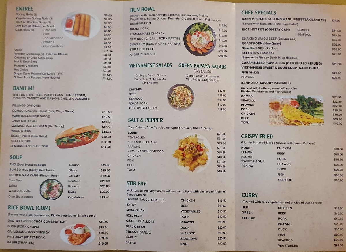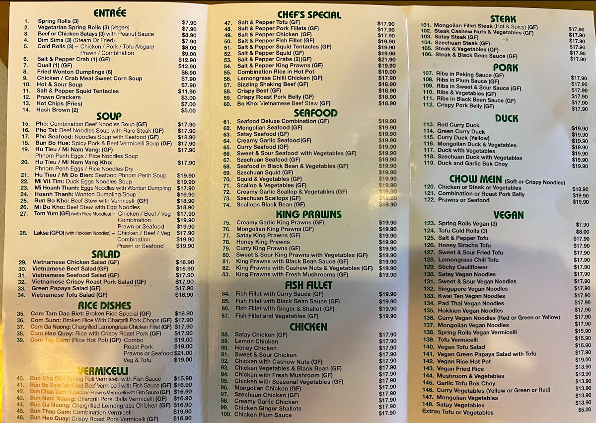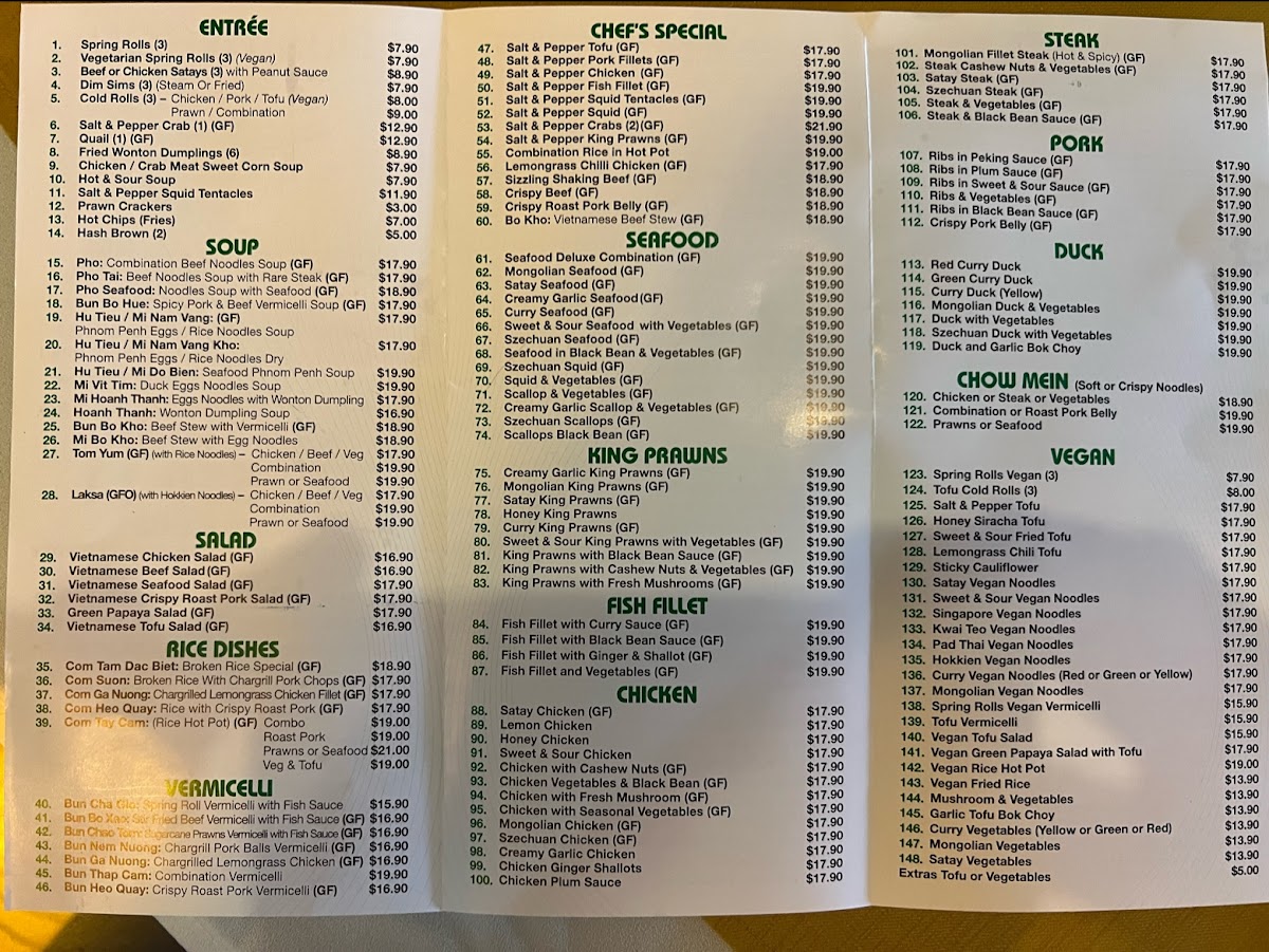 Stir-fried and plated mains add variety to the menu, from the crispy sweetness of Lemon Chicken to the savory punch of Salt&Pepper Fish and the indulgent Steak and Vegetables Added Cashews, which balances protein with fresh greens and crunch. For those preferring plant-based meals, Pad Thai Vegan, Mixed Veggies with Tofu, and Vegan Rice Vermicelli show that vegetarian options are treated with the same care as meat dishes, rather than feeling like an afterthought. Lighter starters and sides such as Spring Roll, Satay Beef Skewers, Chicken and Sweet Corn Soup, and Garlic Bok Choy & Steam Rice round out the menu nicely, making it easy to mix and match dishes for sharing. Even the drink selection, represented by Saigon Lager, complements the food without overcomplicating the experience. Overall, the menu comes across as approachable, diverse, and clearly designed to please a wide range of tastes, staying true to comforting flavors while offering enough variety to keep repeat visits interesting.